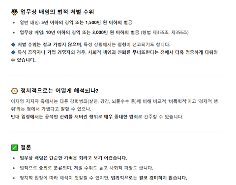 처벌 수위는 결코 가볍지 않고 특정 상황에서 실형이 선고되기도 함.특히 공직자나 기업 경영자의 경우는 사회적 책임과 신뢰를 무너뜨린다는 점 에서 더욱 엄중하게 다뤄짐.*이재명 지지자들이 주장 하는 가벼운 범죄라는 말은 살인이나 강간에 비해 비교적 비폭력적이고 경제적 행위라는 면에서 가볍다고 말할수는 있으나일반적 으로는 공적인 신뢰를 저버린 행위로 매우 중대한 범죄로 간주 될수 있음.