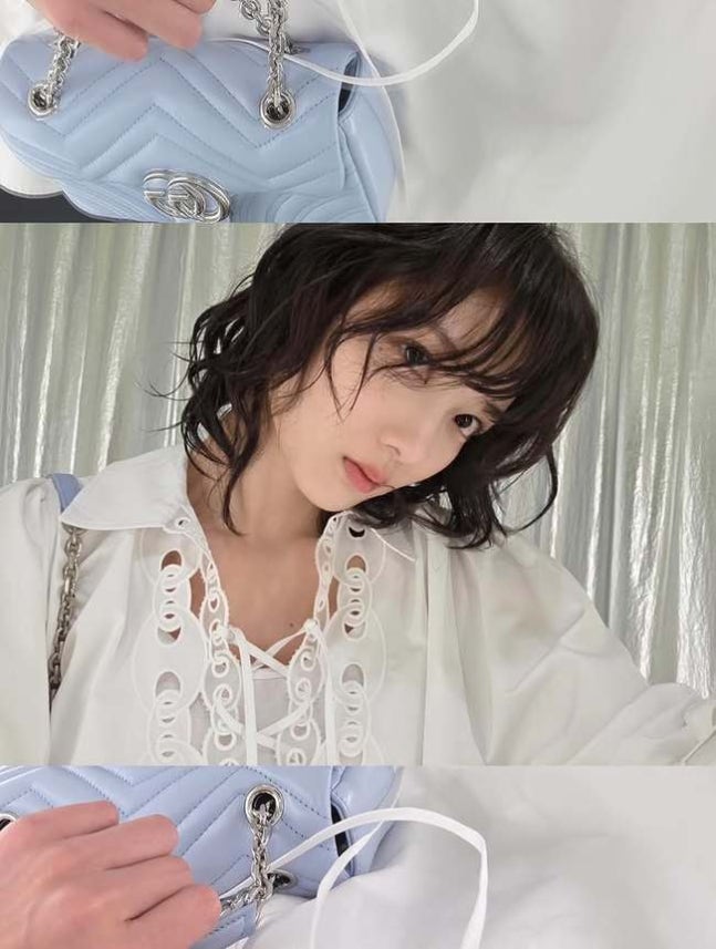 한쪽 어깨에 걸친 하늘색 명품 브랜드 G사 가방이 김유정의 세련된 매력을 돋보이게 한다.