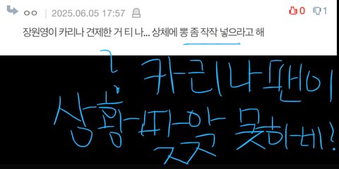 +카리나 논란 터진지 몇일밖에 안지났는데 카리나팬이 상황파악을 못하고 카리나를 올려치면서 추하게 장원영을 욕한 추한 답글사진임