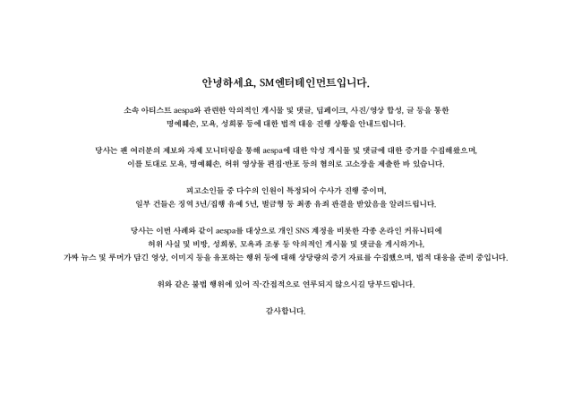 5일 SM엔터테인먼트는 "소속 아티스트 aespa와 관련한 악의적인 게시물 및 댓글, 루머의 유포, 딥페이크, 사진/영상 합성, 글 등을 통한 명예훼손, 모욕, 성희롱 등에 대한 법적 대응 진행 상황을 안내드립니다"며 "당사는 팬 여러분의 제보와 자체 모니터링을 통해 aespa에 대한 악성 게시물 및 댓글에 대한 증거를 수집해왔으며, 이를 토대로 모욕, 명예훼손, 허위 영상물 편집·반포 등의 혐의로 고소장을 제출한 바 있습니다"고 알렸다.