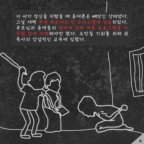 외진 곳에 가서 세상의 인터넷 수단을 끊고 그곳에서 목사님이 세뇌시키듯 교육받게 하는 것이 바로 '강제개종'입니다.