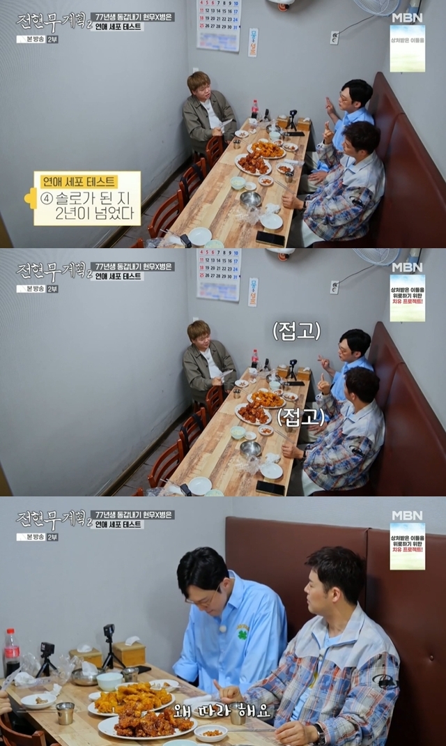 특히 전현무와 박병은 모두 "솔로가 된 지 2년 넘었다?"라는 질문에 "YES"라고 밝혀 눈길을 끌었다. "소개팅이 들어오면 귀찮아서 거절한다?"라는 질문에도 "YES"라고 답했다.