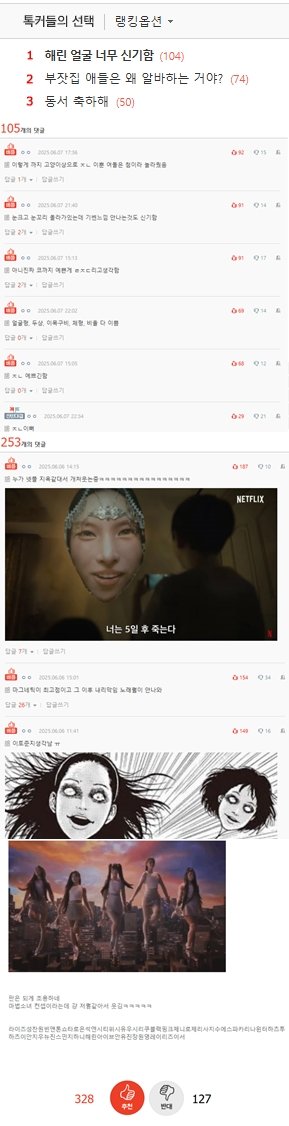 지금 강해린 이쁘다고 톡선1위 올리고 지들끼리 빨아주고 난리나고 어제 아일릿은 컴백시기에 맞춰 아직도 단체로 몰려와서 조롱질로 톡선 올리고... 이10새기들 아직도 정신 못차림. 절대 용서가 안됨... 어차피 뉴진스는 끝났고 해체 수순을 밟겠지만 딱봐라 뉴진스 없어져도 아일릿 은퇴하는 그날까지 이새기들은 욕하고 조롱할거임... 진짜 못돼쳐먹었음. 이런거보면 진짜로 정의가 있긴한가 싶음. 아일릿이 도대체 뭔 잘못을했는데??