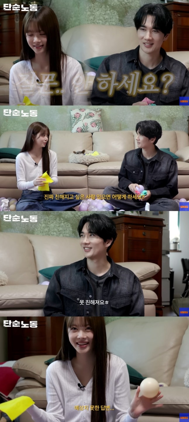 /사진=유튜브 채널 '워크맨-단순노동' 영상 캡처연예계에서 낮가림 심한 대표적인 인물인 엄태구는 억지의 꾸밈 없이 자신의 모습 그대로 '단순노동'을 진행했다. 엄태구는 MC임에도 첫 회에서 게스트인 르세라핌 홍은채에게 역으로 질문세례를 받는가 하면, 2회에서 게스트 스윙스, 윤남노에게 질문을 받으며 뚝딱이는 모습을 보였다.