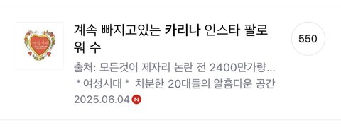 팩트: 원래 팔로워 저정도 되는 아이돌들은 가끔씩 유령계 팔로워 사라짐 애초에 정치 씹과몰입한 커뮤충들이나 인스타 피드 하나로 발작하지 일반인들은 카리나가 그런 피드 올렸다가 내린지도 모름 ㅅㅂ 물론 저 이슈로 언팔한 사람이 없진 않겠지만 걍 조카음침해 팔로 빠지나 안빠지나 캡따서 망하라고 염불외는거자체가