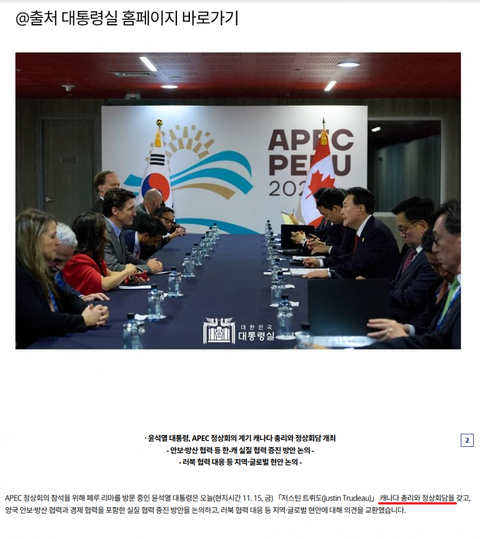윤석열 대통령, APEC 정상회의 계기 캐나다 총리와 정상회담 개최 상세보기|페루 공식 방문 및 APEC 정상회의, 브라질 G20 정상회의 참석 | 2024년 외교부