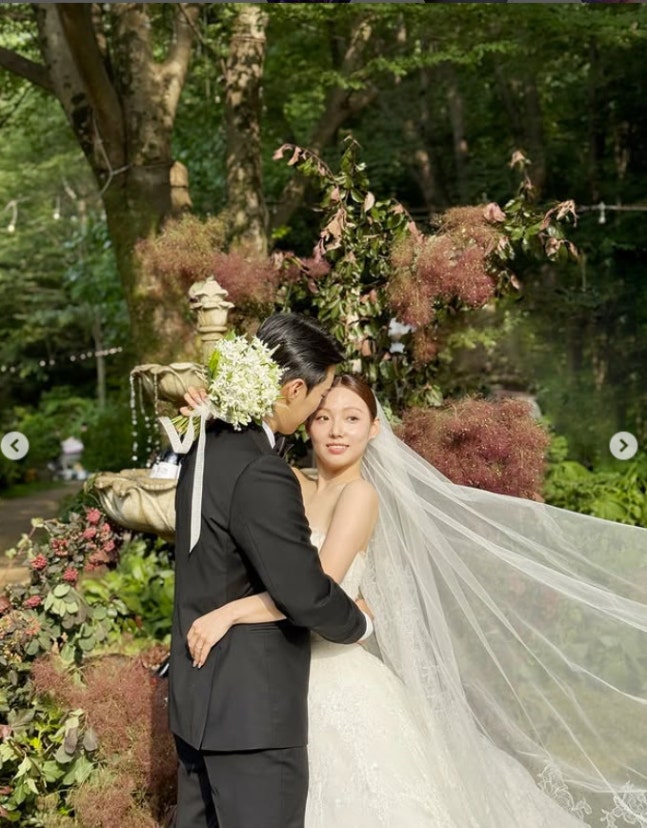 사진 속에는 지난 7일 서울 모처에서 결혼식을 진행한 민의 모습이 담겼다. 하얀 웨딩드레스를 입고 남편과 로맨틱한 순간을 연출하고 있는 민의 모습이 눈길을 끈다.