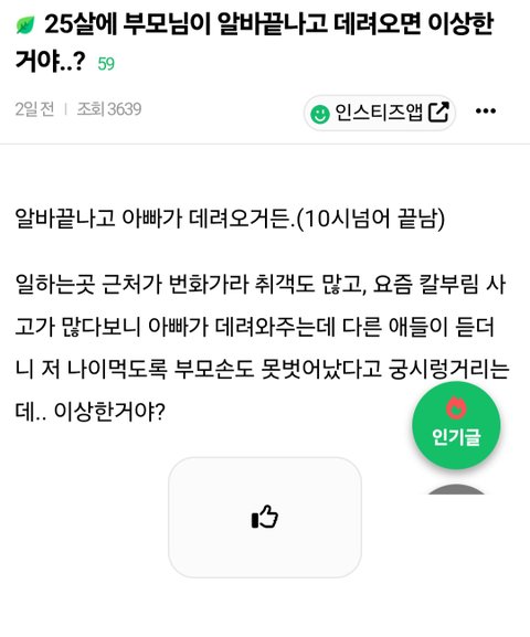나쁘지않다고봄 대학교 입학하자마 마감알바하는 바람에 항상 늦게끝나서 종종데려오심 어느날 마감끝나고 점장 포함 같이 회식함 다들 들떠서 2차 3차 가자는 분위기였고 그때어리다보니 그 분위기에 휩쓸렸는데 마침 아빠가 데리러오심;; 아빠가 점장한테 이제 20살된 애들은 돌려보내야지 12까지 먹이냐고 그래서 그땐 되게 아빠가 극성이라고 생각했는데 그때이후로 점장이 껄떡거리지않았음;;