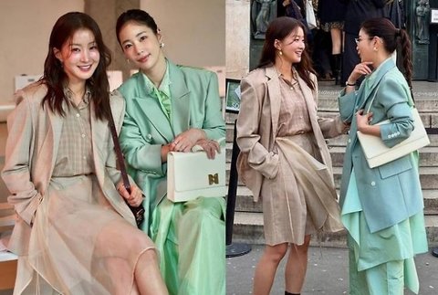 반면 기은세는 파스텔 민트 컬러의 매니시한 슈트에 화이트 백을 더해 시크하면서도 페미닌한 매력을 강조했다. 톤온톤 스타일링과 절제된 디테일이 돋보이며, 두 사람은 극과 극 스타일링으로 완벽한 조화를 이뤄냈다.