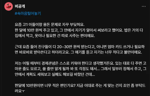 나 때는 10만원이었으면 충분했는데, 남자애면 더더욱 뭐 쓸 일이 별로 없지 않나? 군것질하고 pc방 가고 노래방가고 뭐 쓸 일이 뭐가 있지