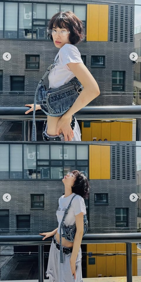 사진 속 나나는 와이드 팬츠에 크롭 티셔츠를 매치해 힙한 룩을 보여준다. 나나는 잘록한 허리 라인으로 개미허리를 자랑한다.