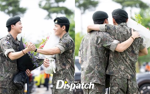 [Dispatchㅣ춘천(강원)=이승훈기자] '방탄소년단(BTS)' RM(본명 김남준)과 뷔(본명 김태형)가 육군 복무를 마치고 10일 오전 강원도 춘천 신북읍체육공원에서 전역식을 가졌다.