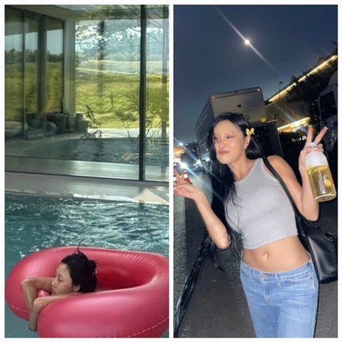공개된 사진 속 화사는 낮에는 실내 수영장에서 빨간 튜브에 몸을 살짝 걸친 채 무심한 눈빛을 보내고 있다