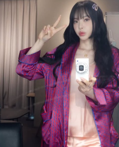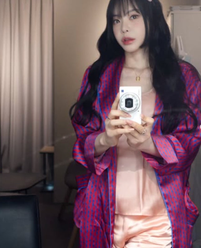 공개된 사진 속 서유리는 핑크색 실크 소재의 잠옷을 입고 그 위에 강렬한 빨간색 가운을 걸친 모습이다. 카메라로 자신의 모습을 촬영하며 만족감을 드러내고 있다.