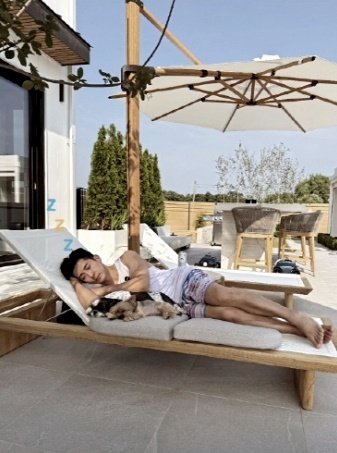 사진 속 브라이언은 반려견과 함께 선베드에 누워 있는 모습이다. 그는 민소매와 반바지를 입고 여유 있게 시간을 보내는 모습으로 눈길을 끌었다.