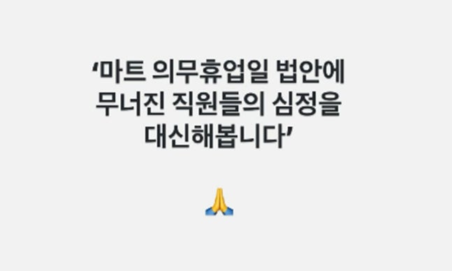 지난 11일 JK 김동욱은 자신의 개인 채널에 "마트 의무휴업일 법안에 무너진 직원들의 심정을 대신해 본다"는 글을 게재했다.