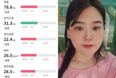 공개된 사진에는 박수지 씨의 인바디 측정 결과값이 담겼다. 체중은 78.6kg에 골격근량은 31.3kg, 체지방량은 22.4kg을 기록한 모습. 이밖에 BMI 수치는 26.5, 체지방률은 28.5%로 점차 표준에 근접해 가는 모습이다.