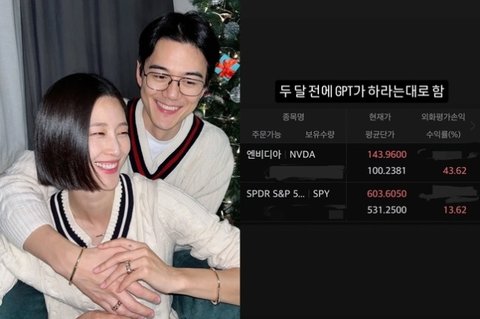 사진 속엔 홍성기의 주식 투자 근황이 담겨 있다. 두 종목의 주식이 전부 수익을 기록하고 있는 상태. 특히 엔비디아의 경우 수익률이 43.62%나 돼 눈길을 끈다. 인공지능 AI가 시키는 대로 투자했다가 대박이 난 근황이 놀라움을 자아낸다.