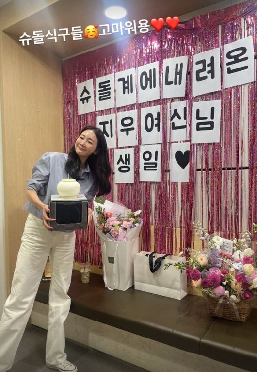 생일 주인공인 최지우는 우아한 올블랙 의상을 입고, 왕관과 어깨띠를 착용한 모습이었다. 언니들의 축하를 받고 환하게 웃으며 행복한 마음을 드러냈다. 모임에서 사랑받는 막내의 행복한 미소였다.