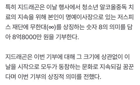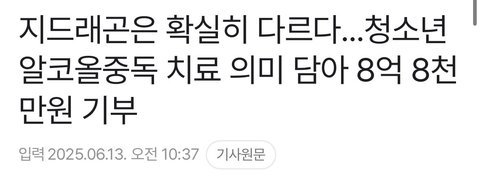 지디 청소년 알코올중독 치료 위해 8억8천만원 기부함