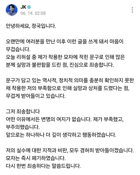 잘못 인정하고 사과했고 모자는 즉시 폐기, 지적과 비판도 겸허히 다 받아들인다고 함