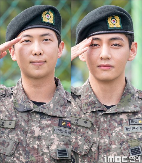 먼저 15사단 군악대와 2군단 군사경찰 특수임무대에서 각각 복무한 RM과 뷔는 10일 오전 강원 춘천시의 한 축구장에서 팬 아미(ARMY, BTS 공식 팬덤명)에게 "필승", "충성"이라며 전역 인사를 건넸다.