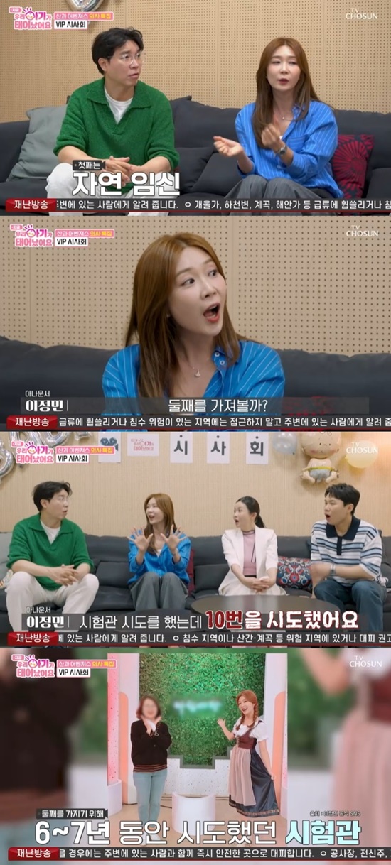 이날 이정민은 "첫째 아이를 13년 전에 자연 임신과 자연 분만으로 낳았다. 그러면 둘째를 가져볼까 싶어서 시험관을 10번을 시도했었다"고 말했다.