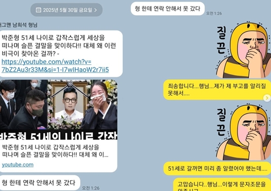공개된 메시지 속에서 남희석은 박준형이 사망했다는 가짜뉴스 링크를 보내면서 "형한테 연락 못해서 못 갔다"고 농담했다. 이에 박준형은 "죄송합니다 행님, 제가 제 부고를 알리질 못해서.. 51세로 갈거면 미리 좀 알렸어야 했는데"라면서 "고맙습니다 행님. 이렇게 문자 조문을 와주시고"라고 유쾌하게 반응했다.