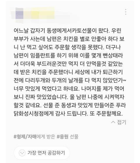 치킨 선물 후기 보다가 가슴이 깝깝해졌네;;