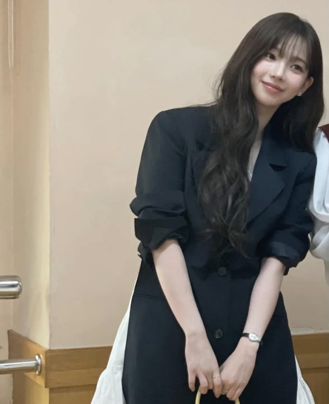 사진 속 카리나는 정장같이 단정한 블랙 블레이저에 심플하면서도 고급스러운 액세서리로 포인트를 줬다.