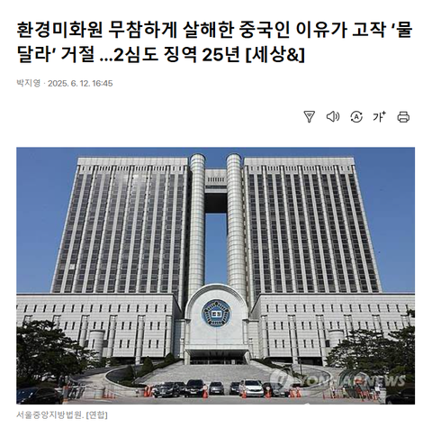 대한민국 환경미화원 무참하게 살해한 중국인남성 이유가 고작 '물달라' 거절