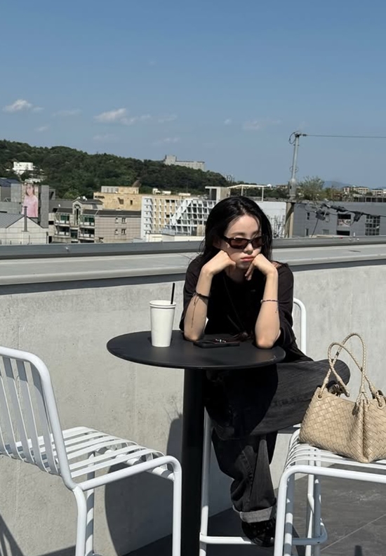 공개된 사진 속 신시아는 선글라스를 쓴 채 뾰로통한 표정을 짓고 있다. 신시아는 올블랙 코디로 시크한 분위기를 자아내고 있다. 특히 그녀가 팔꿈치를 올리고 있는 테이블부터 핸드폰, 운동화까지 검은색으로 통일된 느낌을 강조했다.