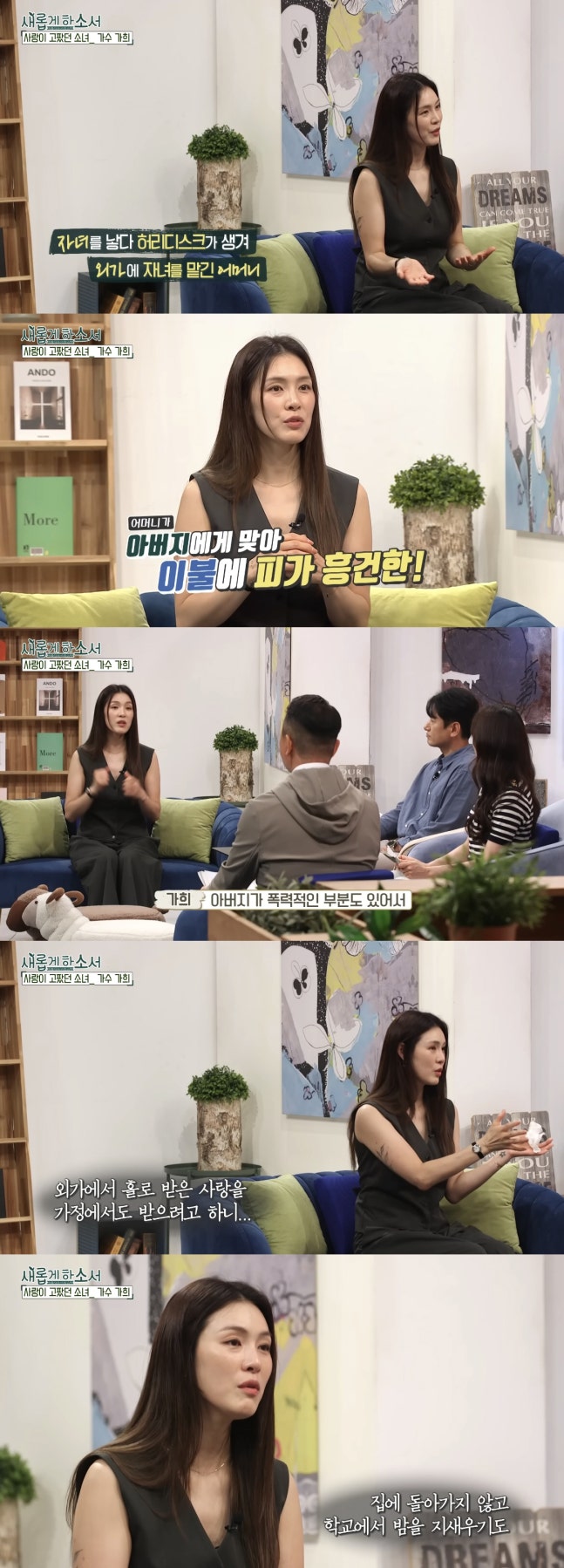 그러면서 "아버지가 폭력적인 부분이 있어서 엄마가 아빠한테 맞아 이불에 피가 흥건했던 기억이 난다. 엄마가 그 이불을 욕실에서 빨았다. 언니도 저를 동생으로 아껴주는 걸 느끼지 못했고 오빠도 저를 때렸다. 툭하면 맞는 게 당연한 일이었다. 몽둥이, 수도꼭지 호수, 벨트, 옷걸이 등 안 맞아본 도구가 없다. 엄마가 그렇게 저를 때렸다"라며 울먹였다. 이를 듣고 놀란 MC 주영훈은 "아빠의 폭행이 엄마에게 이어지고 엄마가 또 가희 씨에게..."라며 말을 잇지 못했다.