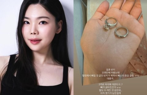 그는 "5kg 차이에 이런다구? 뼈가 굵어진건가. 발도 더 커진 것 같은데.. 아직 붓기가 남은걸까 둘째라 그런걸까 아들이라 그런걸까..? 괜히 사알짝 우울"이라며 꽉 끼는 결혼반지에 당황했다.