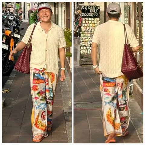그가 선택한 여행룩은 마치 현지 로컬 아트 마켓에서 막 나올 듯한 컬러풀한 와이드 팬츠에 헐렁한 니트 셔츠, 슬리퍼였다. 편안하면서도 힙한 감성이 살아 있는 착장이었다.