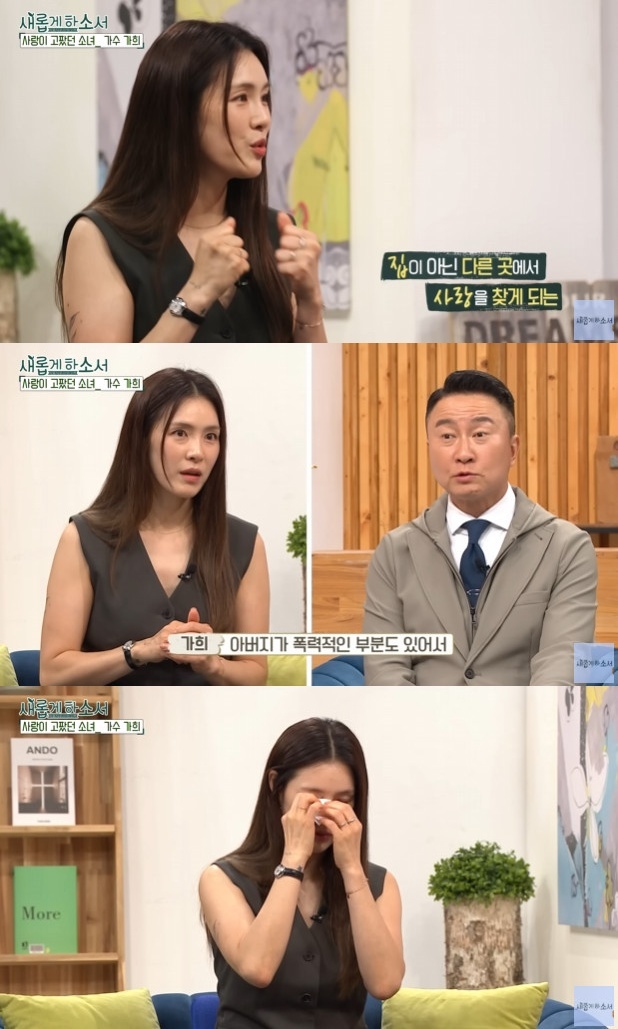 가희는 "하루는 어머니가 아빠에게 맞아 이불에 피가 흥건했다. 엄마가 그걸 욕실에서 조용히 빨던 장면이 기억난다"며 "저도 툭하면 맞았다. 몽둥이, 벨트, 옷걸이 등 안 맞아본 도구가 없었다. 엄마가 그렇게 저를 때렸다"고 말하며 눈물을 보였다.