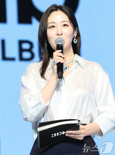 (서울=뉴스1) 권현진 기자 = 방송인 신아영이 16일 오후 서울 광진구 광장동 예스24 라이브홀에서 열린 아일릿 세 번째 미니앨범 'bomb' 발매 기념 쇼케이스에서 진행을 하고 있다. 2025.6.16/뉴스1