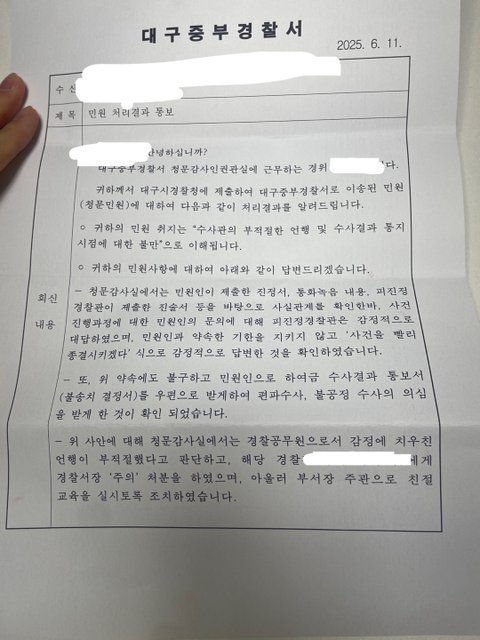 수사관에게 통화로 항의하자 수사관은 갑자기 본인의 기분이 나쁘니 즉시 사건을 종결하겠다는