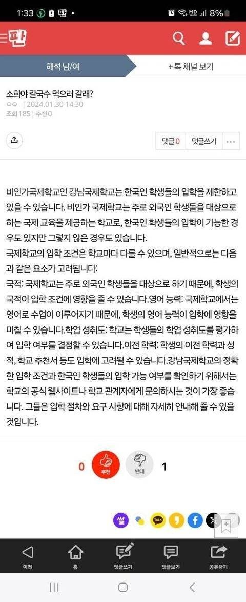 내가 여기왔을때 "비인가국제학교"왜 계속 따라와서 다음 글로 올렸어? 그 글이 사는얘기, 40대이야기, 사랑판 들을 넘나 들었어.