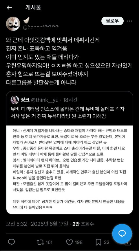 데뷔 때 쳐맞아서 피해의식 있는건 알겠는데