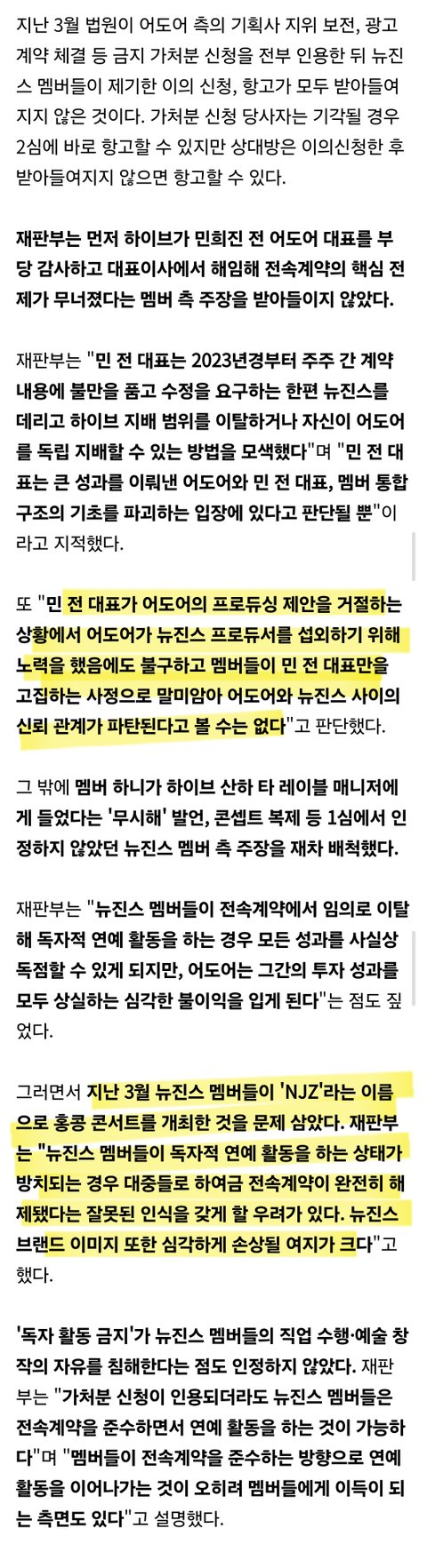 항고 기각된 사유들 보면 민희진 배임 관련 소송도 조온나 불리해질듯 판사가 대놓고 “2023년경부터 주주 간 계약에 불만을 품고 수정을 요구하는 한편 뉴진스를 데리고 하이브 지배 범위를 이탈하거나 자신이 어도어를 독립 지배할 수 있는 방법을 모색했다.”고 말한거 보면