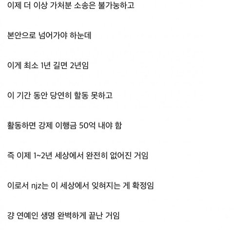 어도어는 아직도 돌아오면 받아주겠단 마인드인데 빨리 돌아가는게 낫지 않을까? 소송기간동안 1살2살 먹어가고 어도어가 더이상 뉴진스 시장가치가 없다고 판단해버리면 위약금 소송 제대로 들어갈텐데