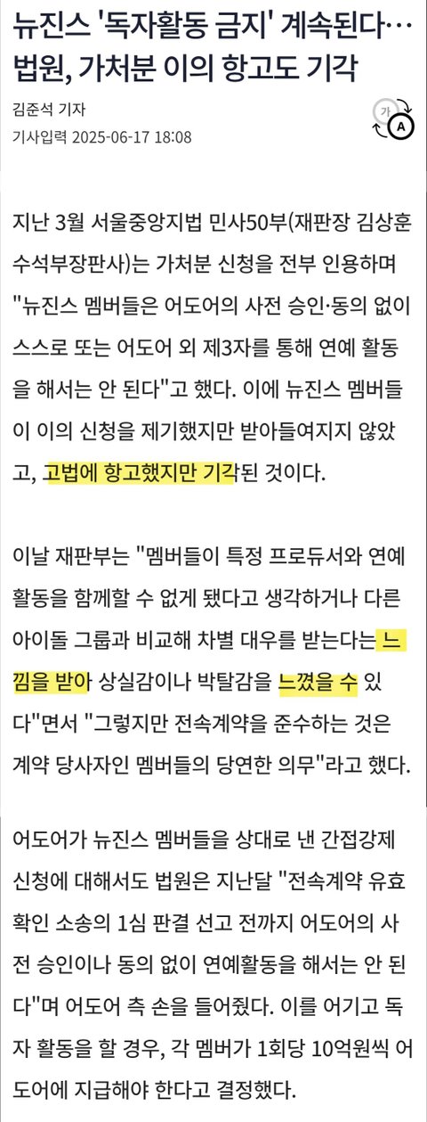 • “오히려 민희진은 하이브의 통합 구조를 파괴하려는 입장으로 판단되며, 이는 전속 계약의 핵심이 하이브임을 더욱 명확히 한다”라고 결정문에 이러한 내용이 명시되었으며, 이는 고등법원 판사의 판단으로 후속 재판에도 영향을 미칠 가능성이 있다.