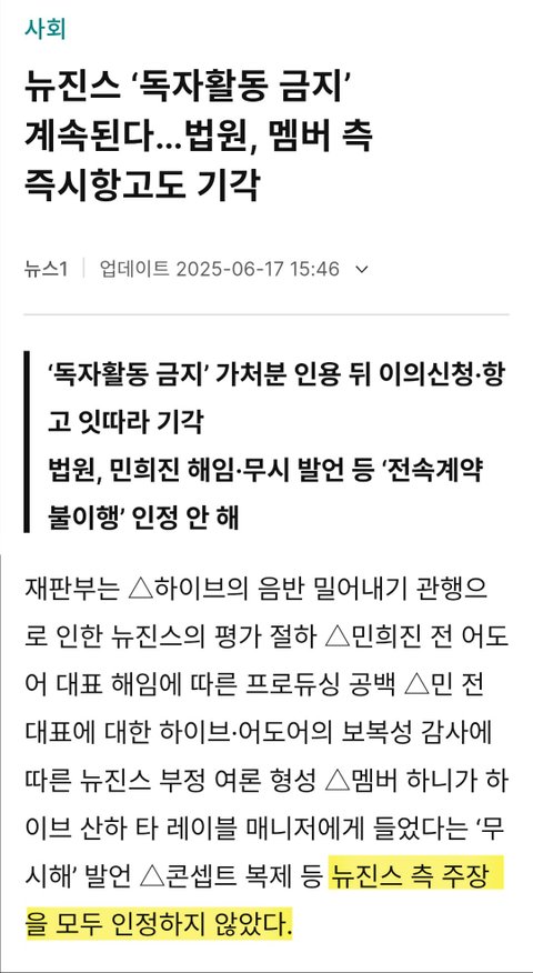 • 재판장이 뉴진스와 세종의 주장에 대해 조목조목 설명한 결정문은 고등법원 판사의 판단으로, 이후 뉴진스 및 민희진 관련 재판에 영향을 미칠 가능성이 높다.