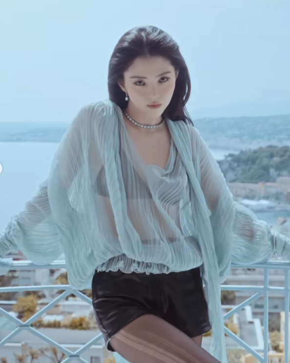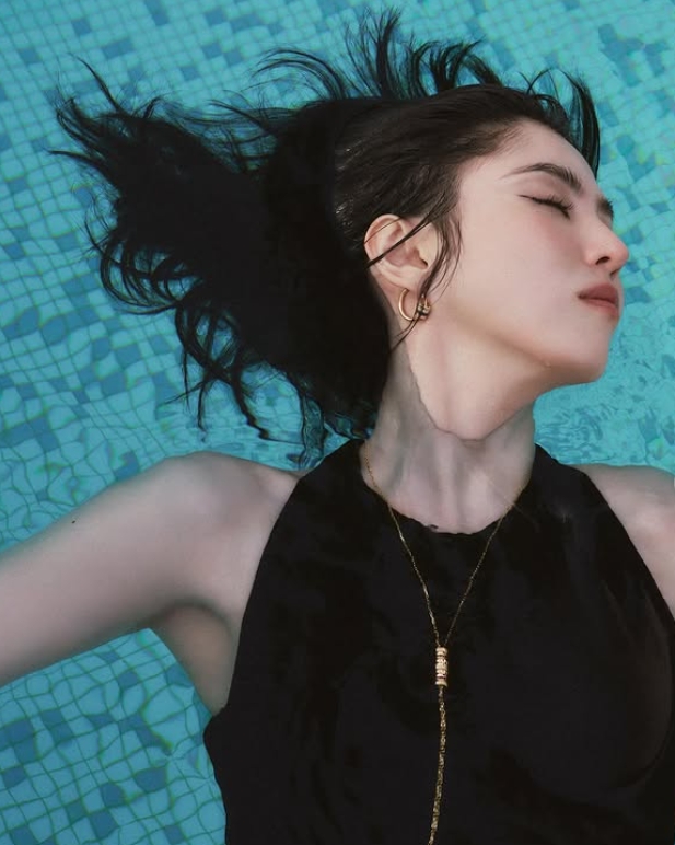 특히 수면 위로 자연스럽게 흩날리는 긴 머리카락과 눈을 감은 채 흐르는 듯한 포즈는 마치 신화 속 인어를 떠오르게 한다. 골드 포인트 주얼리와의 조화도 완벽했다. 얇고 길게 떨어지는 목걸이와 후프 이어링은 그녀의 여리면서도 카리스마 있는 분위기를 더욱 부각시켰다.