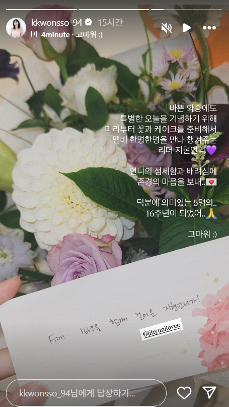 허가윤은 "화이팅. 전과는 또 다르게 반짝이고 있는 지금의 그리고 앞으로의 언니를 응원해"라고 댓글을 남겼고. 권소현 또한 "바쁜 와중에도 특별한 오늘을 기념하기 위해 미리부터 꽃과 케이크를 준비해서 멤버 한명 한명을 만나 챙겨주는 리더 지현언니. 언니의 섬세함과 배려심에 존경의 마음을 보내. 덕분에 의미있는 5명의 16주년이 됐어"라고 감동을 전했다.