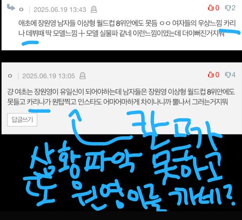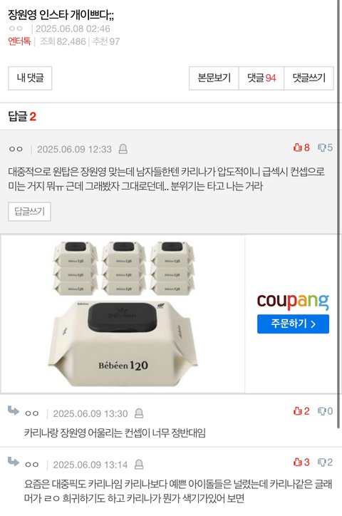 +카리나팬들이 카리나글이나 장원영을 칭찬하는 글에와서 추하게 카리나랑 비교하면서 원영이를 내려치면서 욕한 사진임ㅉ