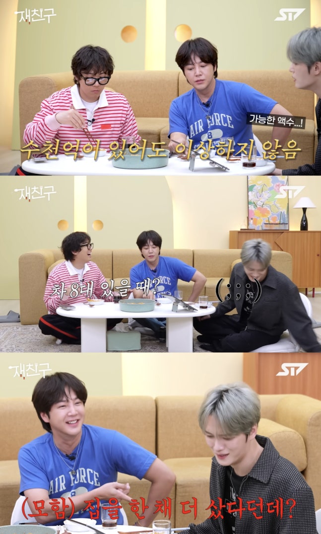 장근석도 거들었다. 그는 "주차장 4대 더 대려고 집을 한 채 더 샀다는 얘기가 있더라. 연예인의 끝 플렉스는 재중이 형"이라고 덧붙이며 분위기를 후끈 달궜다.