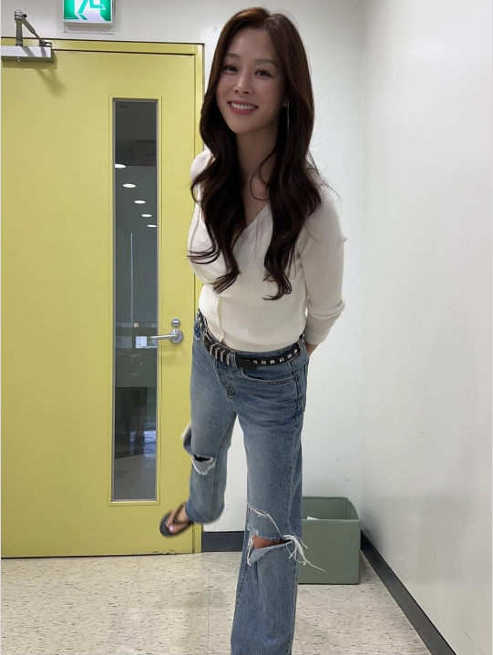 장신영이 근황을 전하며 ‘찢청+슬리퍼’라는 반전 패션으로 시선을 모았다. 사진=장신영 SNS