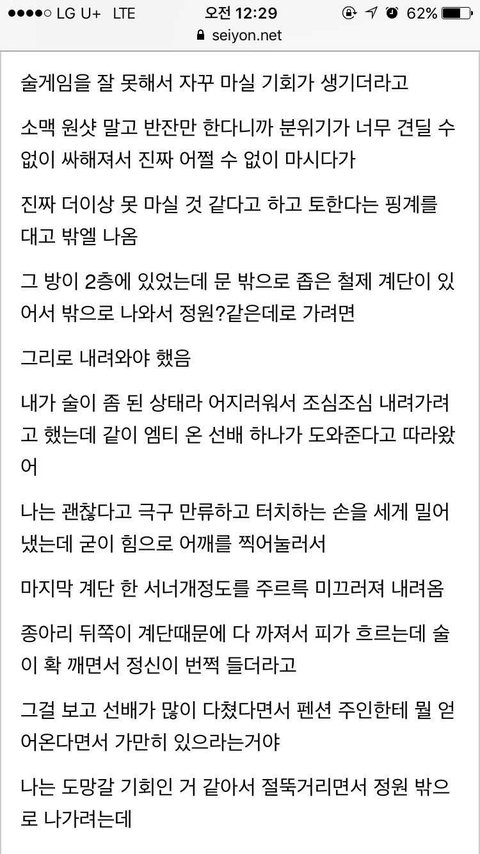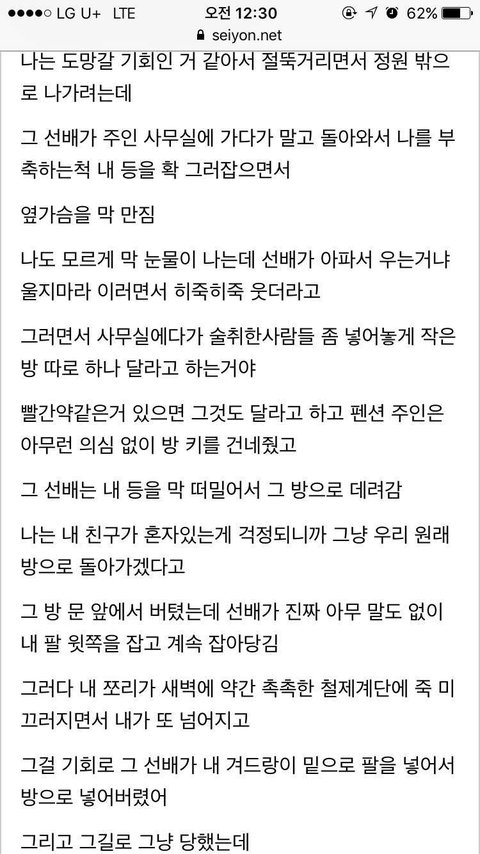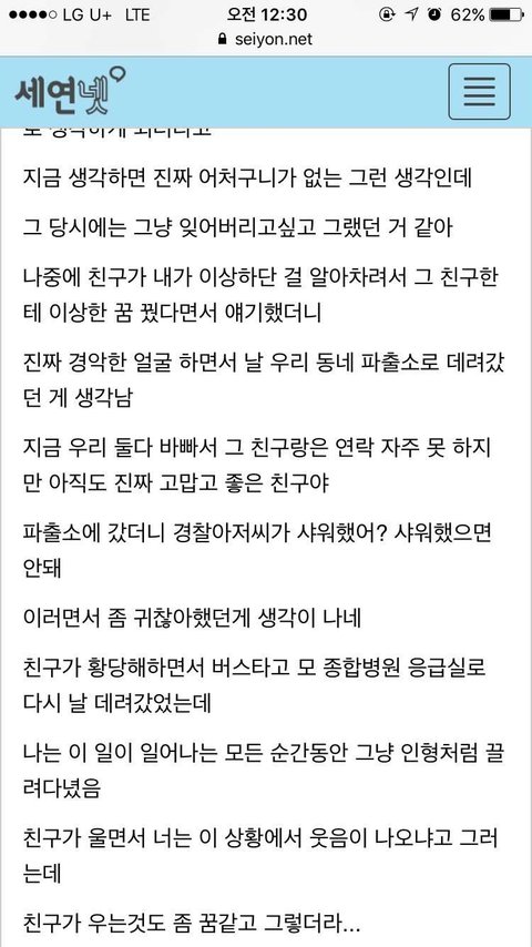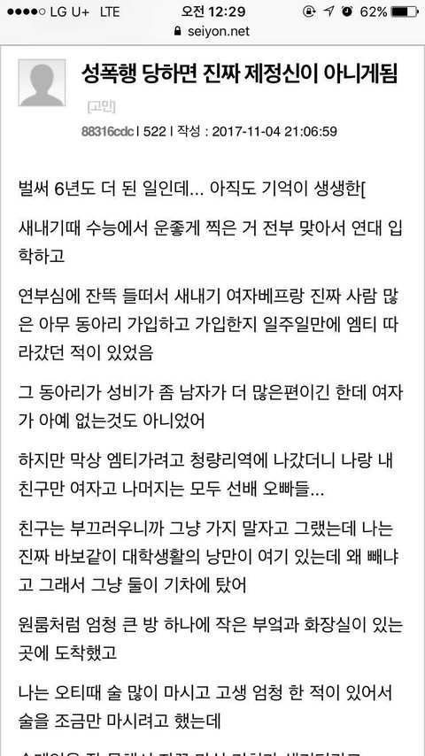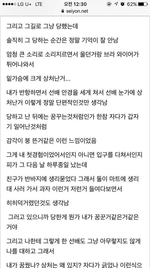 6살, 초등때 2번 전부 다 다른남자 마지막 아저씨는 식칼로 나를 위협했고 끌려가는 골목길에서 살려달라핬지만 마주친 두아줌마는 남자가 제딸이라하니 그냥 지나감.. 공사장에서의 기억은 거의없음 당시엔 그냥 흰액체라고 생각했던 것을 본 기억과 100까지 세아리고 나오라고했던것 밖에. 그때 나는 아무것도 모르던 어린이라 안다쳤다고 생각하고 부모님한테 말안했고 커서는 지나간일이라 말안했음 이런일 비일비재할듯